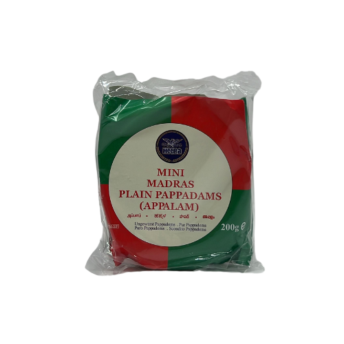 Heera Mini Madras Plain Pappadams (Appalam) 200g are traditional thin, crispy Indian snacks made from high-quality lentil flour. Measuring 4 inches, these pappadams offer a perfectly light and crunchy texture, ideal for frying or microwaving. Their authentic Madras style enhances any meal with a subtle, savory bite, making them a versatile accompaniment to curries, chutneys, or as a standalone snack. Conveniently packaged, they ensure consistent quality and easy preparation for an expert touch in your kitchen.